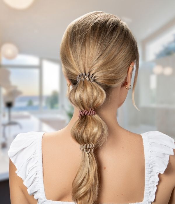 Im Gegensatz zu herkömmlichen Haargummis üben Spiral-Haargummis keinen punktuellen Druck auf das Haar aus. Stattdessen verteilt sich die Spannung bei Spiralgummis gleichmäßig. Dadurch entstehen wesentlich weniger Haarbruch, keine Druckstellen und das Haar wird geschont.